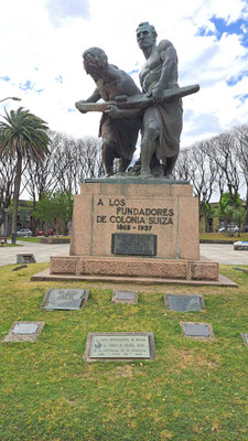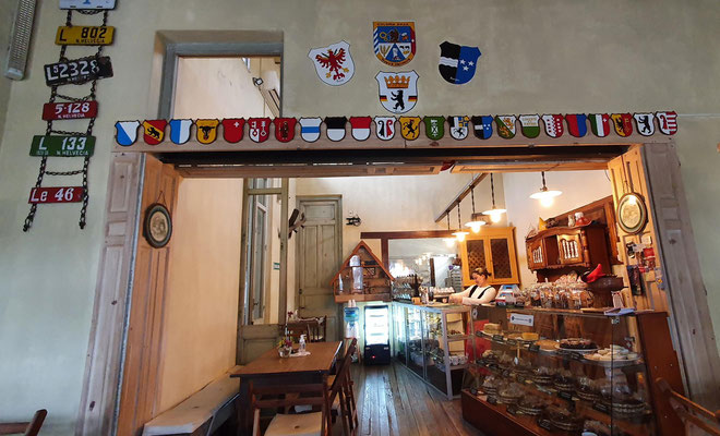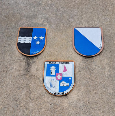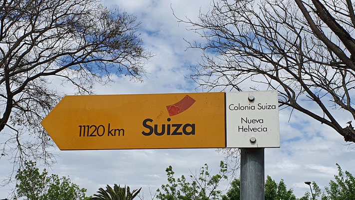 Zuerst geht es nach Nueva Helvecia oder Colonia Suiza; eine Schweizer Kolonie in Uruguay, die 1862 gegründet wurde. Wieviel Swissness werden wir da noch antreffen? Zuerst fallen die Schweizer Kantonswappen auf, die an nicht wenigen Wohnhäusern angebracht sind. Dann Ladengeschäfte, in deren Namen oder Logo die Schweiz auftritt. Zum Beispiel «Clinica Suiza», mit Schweizerkreuz im Logo. Höhepunkt dürfte der gelbe Original Schweizer Wanderweg Wegweiser sein, der auf dem zentralen Dorfplatz in Richtung Schweiz zeigt und die Entfernung in Kilometern angibt. Während wir im Restaurant beim Mittagessen kaum etwas von Swissness spüren, geht es dafür im Schokoladeladen von «Tante Eva» nochmals sehr schweizerisch zu und her. Schokoladekuchen klar, aber da hängen auch alle Schweizer Kantonswappen und der Inhaber – pensionierter Professor, in Uruguay geboren - erklärt uns seine Herkunft aus dem Kanton Aargau, aus Berlin und Tirol. Es entwischen ihm sogar ein paar Worte Deutsch.