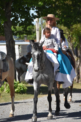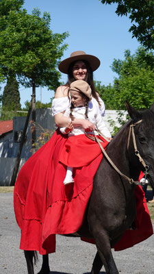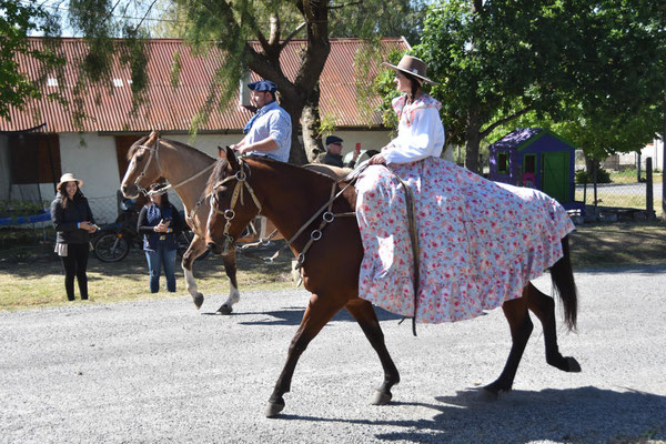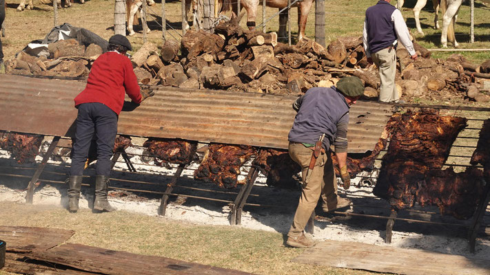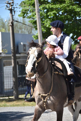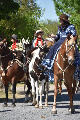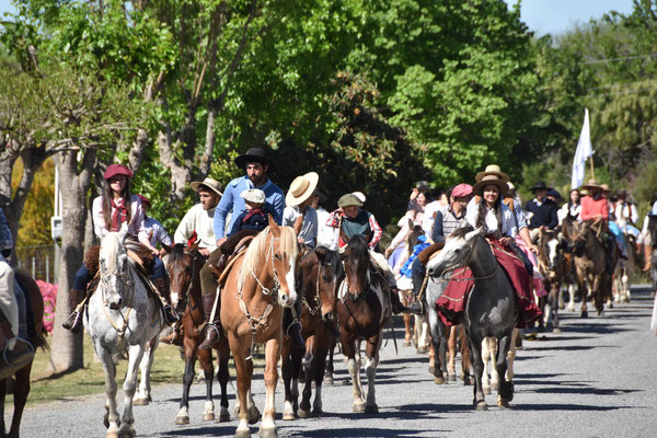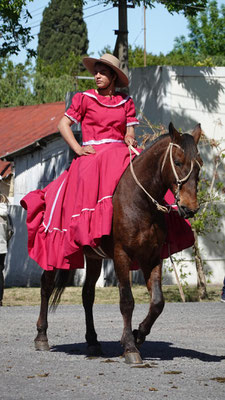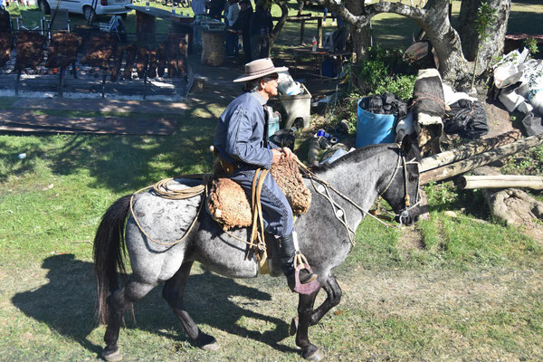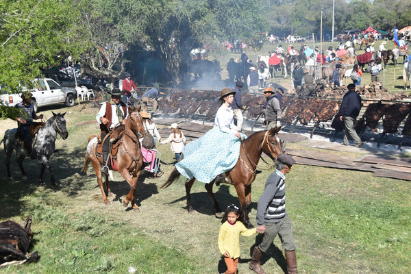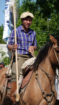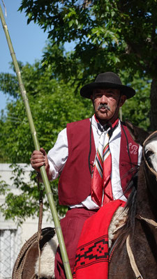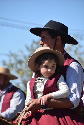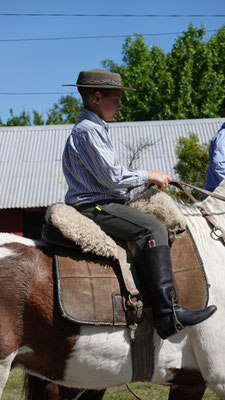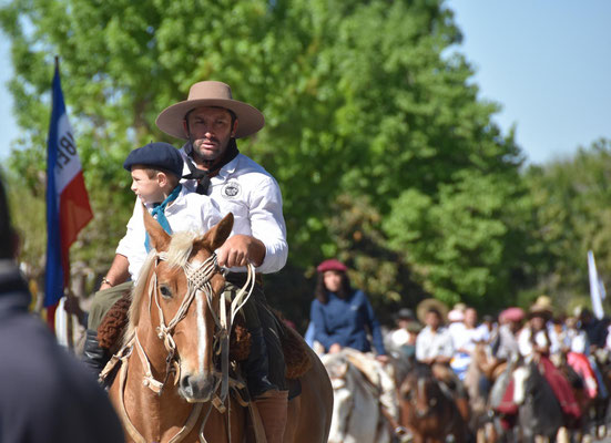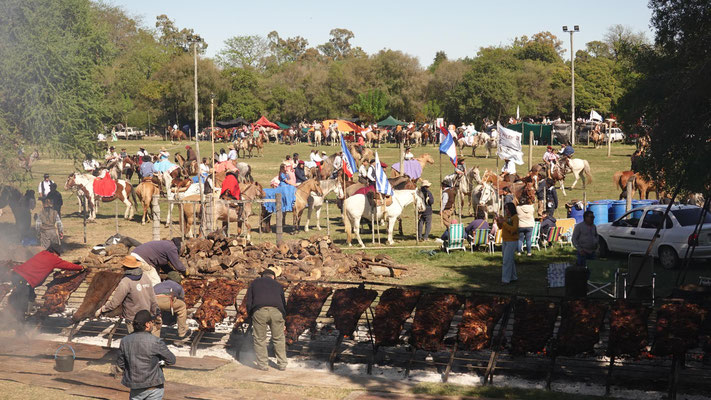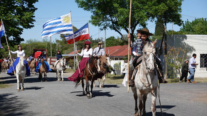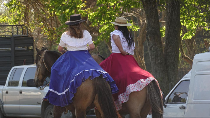 Tatsächlich hört man am Morgen, wie die Pferde eintreffen und nach der Besammlung auf einer zentralen Wiese, wo auch der obligate Asado schon am Braten ist, geht die Parade los. Wir können das direkt vor unserem Haus mitverfolgen. Geschätzte 300 Pferde mit ihren Reitern. Kinder auf ihren Pferden. Und auch der jüngste Nachwuchs ist in voller Montur dabei: Babys und Kleinkinder werden auf den Pferden «mitgeführt». Frauen mit weiten, traditionellen Röcken, die bis über das Hinterteil des Pferdes reichen. Die Gruppen reiten zusammen; zuvorderst trägt einer die Standarte der Gruppe. Sehr authentisch, sehr eindrücklich. Man spürt den Stolz dieser Leute für ihren Berufsstand.