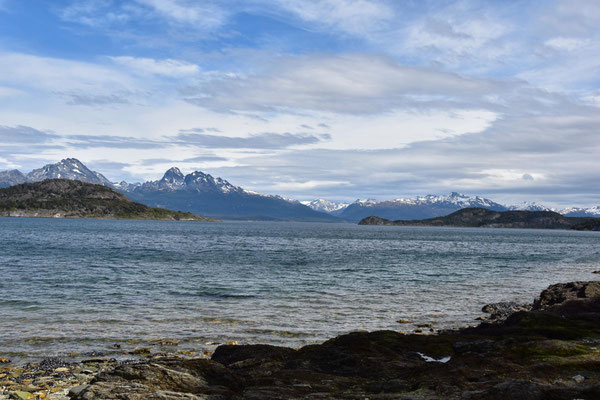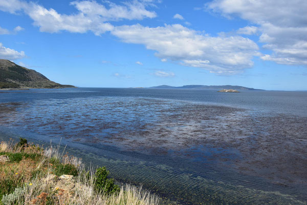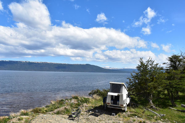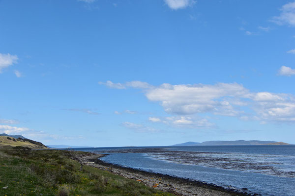 Nach Osten geht’s dem Beagle Kanal entlang raus, vorbei an Kap Horn in Richtung Antarktis. Das ist unser nächster Abstecher. Hier draussen ist die Natur noch ein bisschen rauher. Aber wir merken davon wenig. Es ist sonnig, kaum Wind (sehr ungewöhnlich) und angenehm warm. Wir passieren die Estancia Harberton und finden einen herrlichen Platz auf einer Steilküste mit direktem Blick dorthin, wo das Kap Horn im Dunst versteckt ist. Wir geniessen einen entspannten Nachmittag.