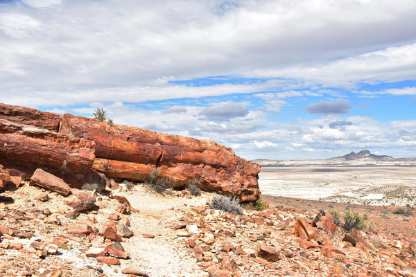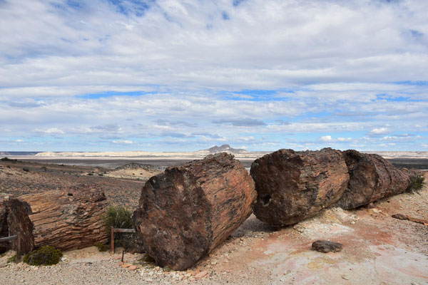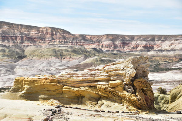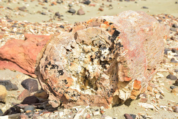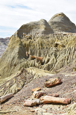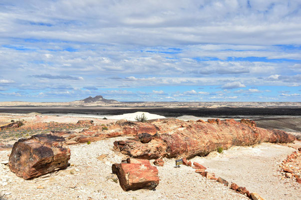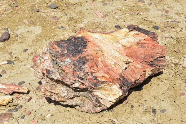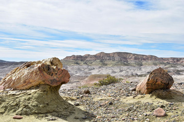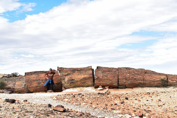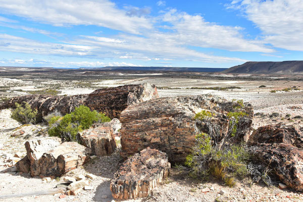 Durch Ölfelder, auf üblen Schotterpisten, geht’s zurück zur Hauptroute. Am nächsten Tag wieder ein 50 Kilometer Abstecher zum zweiten «Wald». Hier ein anderes Bild. Vor rund 150 Millionen Jahren wurden die riesigen Araukarien durch einen Vulkanausbruch (starke Sturmwinde und Asche) gefällt und liegen alle in etwa in gleicher Richtung. Auch in dieser Wüstenlandschaft sind sie natürlich wieder durch Erosion zum Vorschein gekommen.