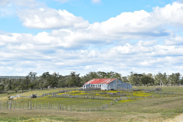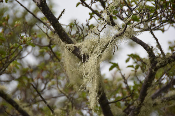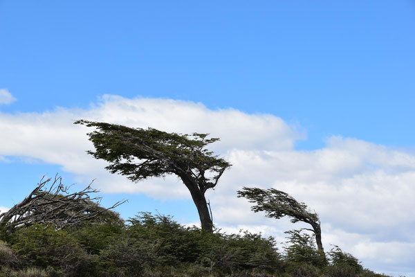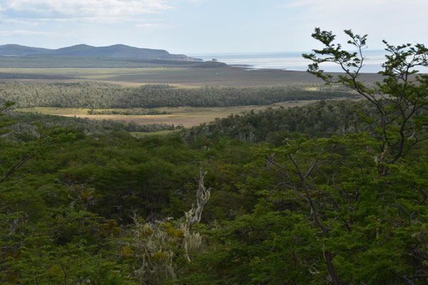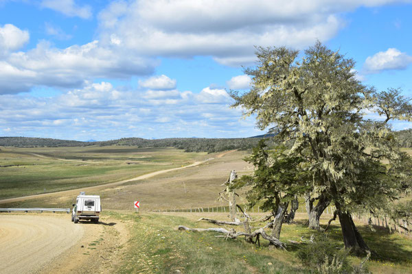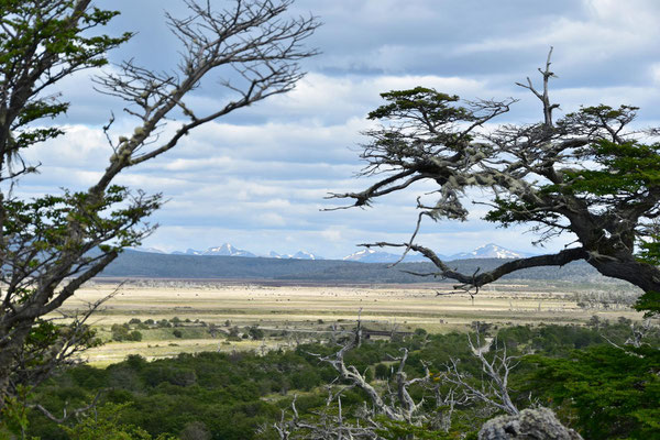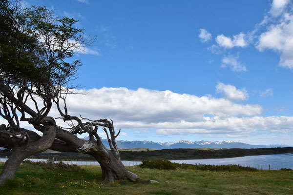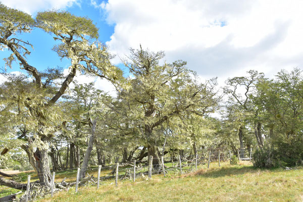 Man kann natürlich auf der Hauptstrasse zügig über Rio Grande nach Ushuaia fahren, aber wir wollen uns dieses Mal für Feuerland Zeit nehmen. Denn die Landschaft ändert sich nun eindrücklich. Es beginnen die Südbuchen-Wälder und es wird wieder hügeliger. Die zerzausten Bäume mit den Bärten aus Flechten vermitteln das Gefühl, in einem Fantasy-Roman angekommen zu sein. In der Ferne sind die ersten noch schneebedeckten Berge zu sehen. Die südlichsten Ausläufer der Anden. Wir passieren die Estancia Viamonte, wo wir vor 32 Jahren schon am dritten Tag unserer Radreise von den Gauchos zum Mittagessen (Suppe, Brot, Tee) eingeladen wurden, weil der Wind zum Radfahren eigentlich zu stark war.
