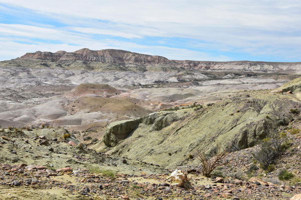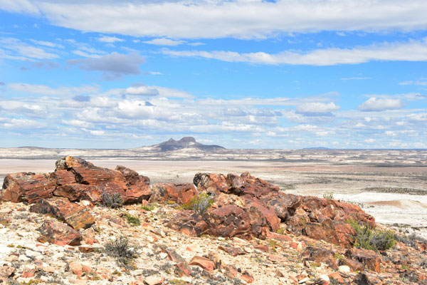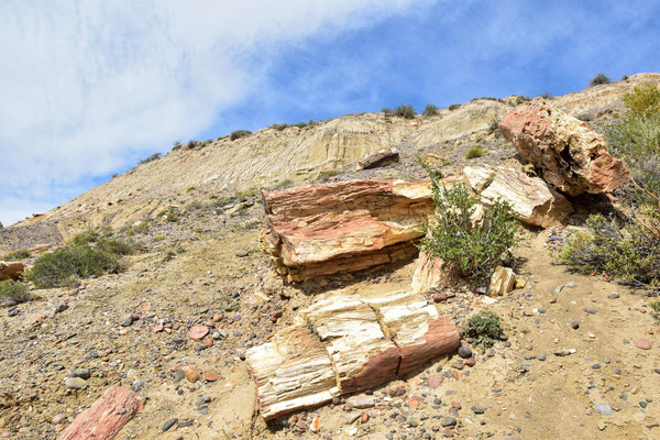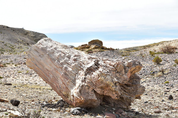 Am nächsten Morgen geht’s dann über eine selbst für den Toyota ziemlich üble Schotterpiste zum versteinerten Wald von Sarmiento. Wir erhalten eine Einführung vom Park Ranger. Die Bäume wurden, nachdem sie abgestorben waren, von Flüssen hierher geschwemmt und mit Sediment überdeckt; durch neu dazukommende Feuchtigkeit konnten sie versteinern. Nun, nach ca. 65 Millionen Jahren, werden sie durch die Erosion wieder freigelegt. Der Ranger schickt uns auf die Runde. Teilweise sieht es aus, wie wenn man in einer Sägerei über Holzschnitzel läuft. Nur sind auch diese steinern. Wieder zurück werfen wir noch einen Blick in das kleine Museum und werden uns wieder der Millionen Jahre bewusst, die solche Prozesse brauchen, währenddessen der Mensch um die hundert Jahre auf dem Planeten verbringt.