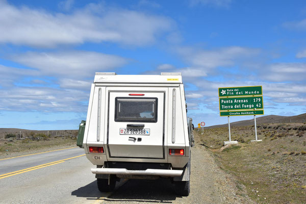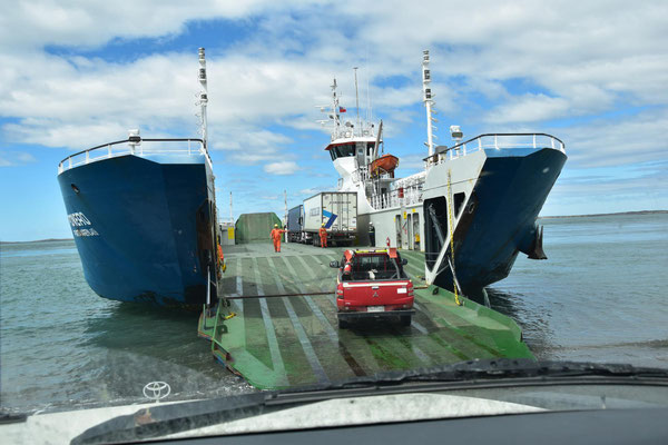 An der engsten Stelle ist die Magellan Strasse nur sieben Kilometer breit und somit ideal für eine Fähre. Ein schönes Gefühl, nach doch einigen Kilometern seit Montevideo nun hier zu sein und auf Feuerland überzusetzen, was etwa zwanzig Minuten dauert. Dann folgen rund 160 Kilometer auf chilenischen Strassen. Dann das Ganze rückwärts. Ausreise aus Chile. TIP wieder abgeben nach ein paar Stunden und wieder neues TIP für Argentinien. Man bekommt rasch Übung in solchen Dingen. Aber alles speditiv und korrekt. Manchmal ein kleiner Schwatz mit den Grenzern. Insbesondere die Fruchtkontrolleure am chilenischen Zoll hatten Freude am Auto. So sprachen wir mehr über das Auto als darüber, ob wir noch verbotene Produkte mitführen. Einer wollte sogar noch den grossen Toyota Motor anschauen und ein bisschen fachsimpeln bevor wir weiterfuhren.
