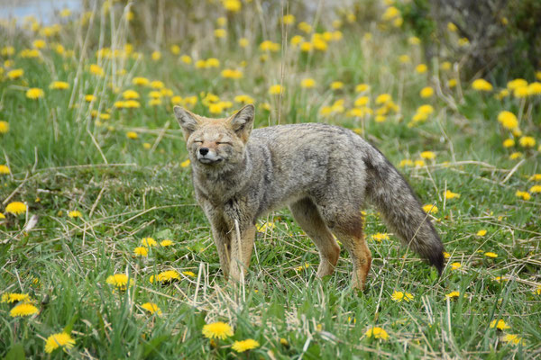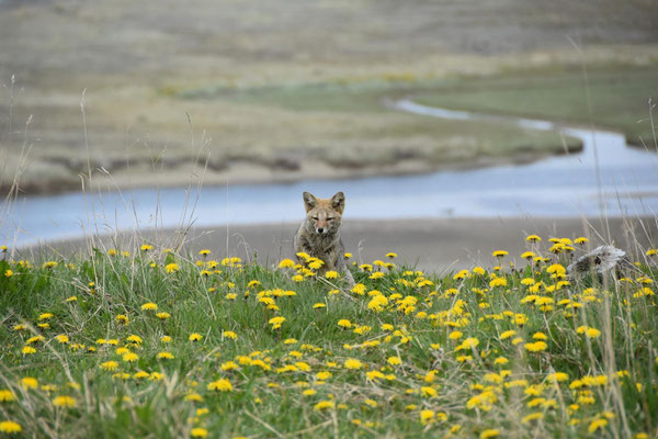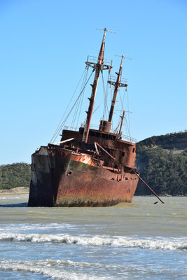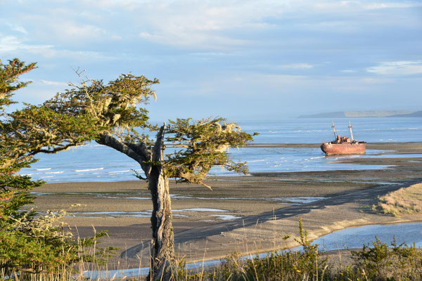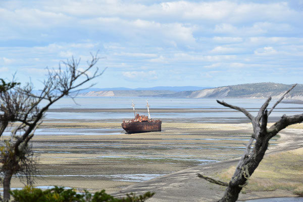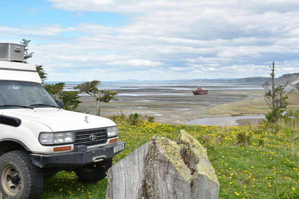 Bald biegen wir von der Hauptroute ab und fahren auf gutem Schotter rund 40 Kilometer dem Nordufer entlang bis zum Cabo San Pablo. Das Wetter zeigt sich von der besten Seite: Mild und kein Wind. Zeit, das Fahren zu beenden und hier einen gemütlichen Nachmittag zu verbringen. Auch ein kleiner Fuchs hat unsere Anwesenheit bemerkt und macht mehrmals die Runde durch unser Camp. Später stossen zufällig noch Sebastian und Anja dazu, die wir schon in Cerro Sombrero getroffen haben. Bei einem Bier gibt es viel zu erzählen und Infos auszutauschen. In der Bucht liegt das Wrack der Desdemona, zu dem man bei Ebbe trockenen Fusses gehen kann.